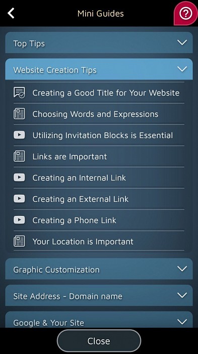 معیاری سائٹ بنانے میں آپ کی مدد کرنے کے لیے، آپ منی گائیڈز کا مینو دیکھ سکتے ہیں جس میں بہت سے قیمتی اشارے اور تجاویز ہیں۔ جب آپ کو اضافی خصوصیات کی ضرورت ہو تب ہی کسی سائٹ کو Smart یا Pro سائٹ میں اپ گریڈ کریں۔